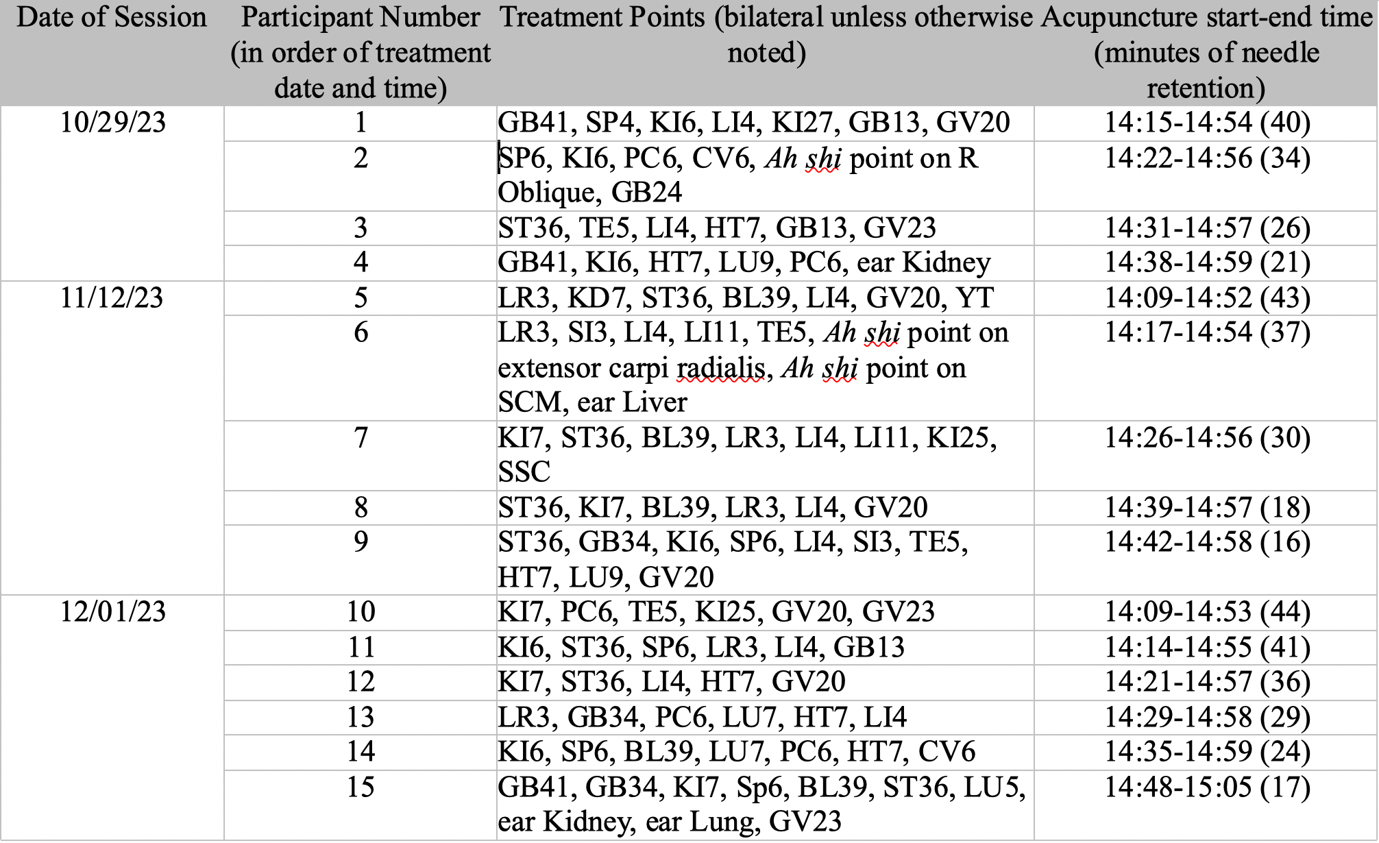 The general locations of the points selected were shared with the participant to gain their consent for treating those areas before needle insertion. All participants were lying supine or reclining on cushions. DBC brand needles, sizes 0.20×30 for body points and 0.16×15 for auricular and scalp points, were utilized. The treatments are summarized in Table 1: